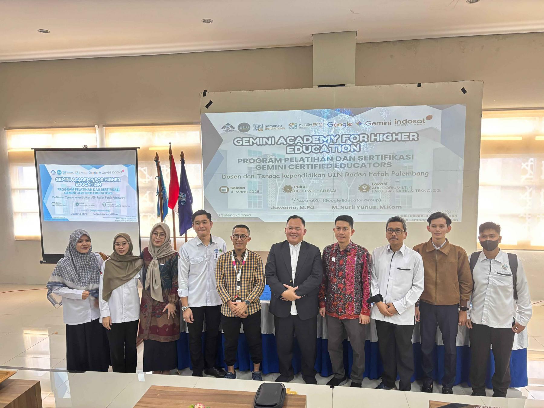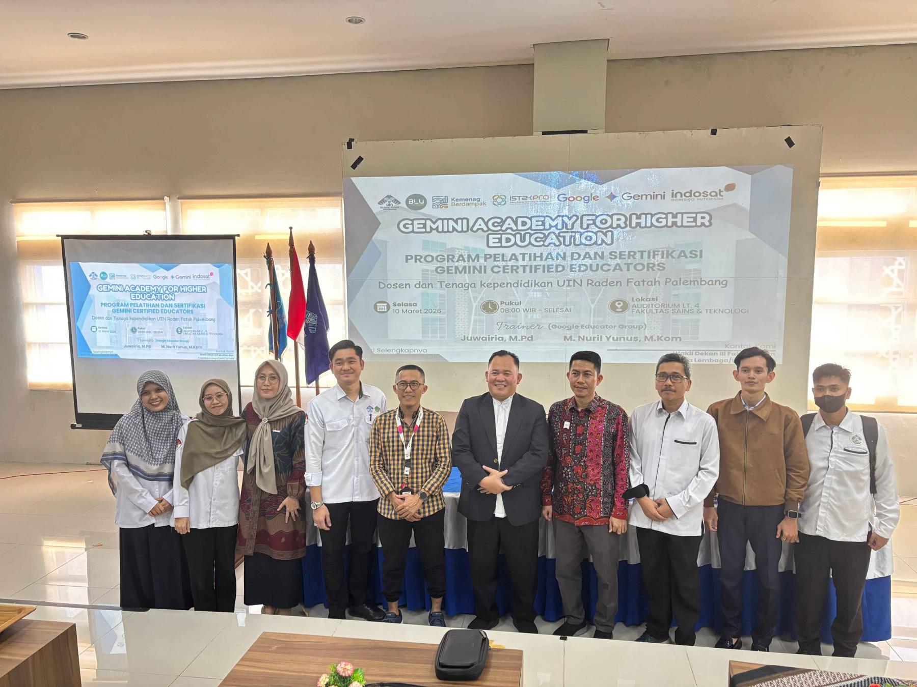 Palembang – Upaya peningkatan kualitas dan kompetensi pendidik di era digital terus dilakukan oleh Program Studi Sistem Informasi Fakultas Sains dan Teknologi (FST) UIN Raden Fatah Palembang. Pada hari ini, Selasa (10/03/2026), jajaran dosen Sistem Informasi turut serta dalam agenda "Gemini Academy for Higher Education: Program Pelatihan dan Sertifikasi Gemini Certified Educators". Kegiatan yang ditujukan bagi dosen dan tenaga kependidikan UIN Raden Fatah Palembang ini diselenggarakan di Auditorium Lantai 4 Fakultas Sains dan Teknologi, dimulai sejak pukul 08.00 WIB. Acara bergengsi ini merupakan bentuk kolaborasi institusi dengan perusahaan teknologi global terkemuka, yakni Google dan Indosat Ooredoo Hutchison. Untuk memastikan materi tersampaikan secara komprehensif, program ini menghadirkan trainer profesional langsung dari Google Educator Group, yaitu Juwiria, M.Pd. dan M. Nuril Yunus, M.Kom.. Fokus utama pelatihan ini adalah membekali para pendidik dengan keterampilan memanfaatkan teknologi Kecerdasan Buatan (AI) Gemini untuk optimalisasi proses belajar-mengajar di pendidikan tinggi. Bagi Program Studi Sistem Informasi, partisipasi aktif para dosen dalam kegiatan ini merupakan langkah strategis yang sangat relevan dengan inti keilmuan prodi. Keikutsertaan ini menegaskan komitmen prodi untuk selalu up-to-date terhadap disrupsi teknologi terkini. Melalui sertifikasi Gemini Certified Educators, dosen-dosen Sistem Informasi diharapkan mampu mengintegrasikan instrumen AI secara etis dan efisien ke dalam kurikulum pembelajaran, riset, serta pengembangan inovasi sistem informasi. Langkah adaptif ini diyakini akan semakin memperkuat kapasitas Program Studi Sistem Informasi dalam mencetak lulusan yang tidak hanya gagap teknologi, melainkan mampu menjadi talenta digital yang siap bersaing di industri masa depan.