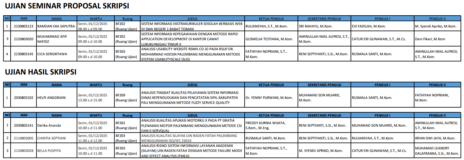 JADWAL UJIAN SEMINAR PROPOSAL, UJIAN HASIL SKRIPSI, DAN UJIAN SKRIPSI Tanggal 01 Desember 2025