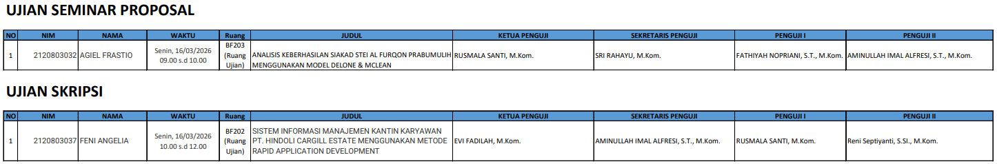 JADWAL UJIAN SEMINAR PROPOSAL, UJIAN HASIL SKRIPSI, DAN UJIAN SKRIPSI Tanggal 16 Maret 2026