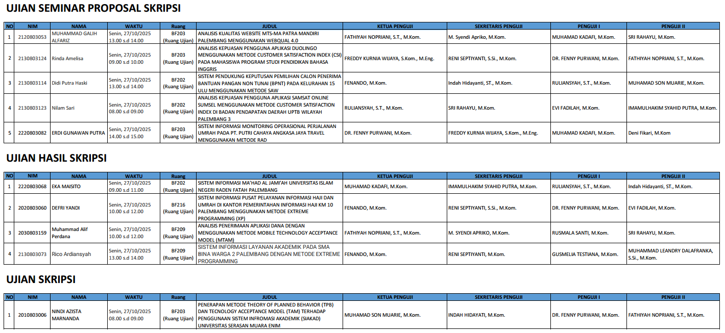 JADWAL UJIAN SEMINAR PROPOSAL, UJIAN HASIL SKRIPSI, DAN UJIAN SKRIPSI Tanggal 27 Oktober 2025.