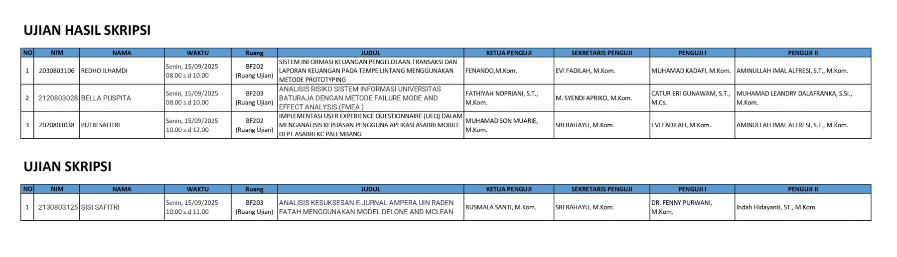 JADWAL UJIAN SEMINAR PROPOSAL, UJIAN HASIL SKRIPSI, DAN UJIAN SKRIPSI Tanggal 3 September 2025